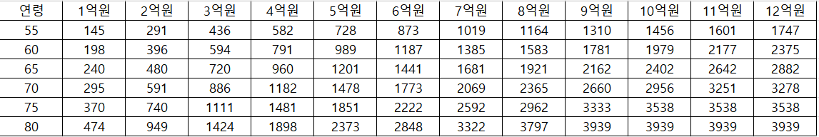 다양한 주택 가격과 나이에 따른 수령액은 다음과 같습니다: